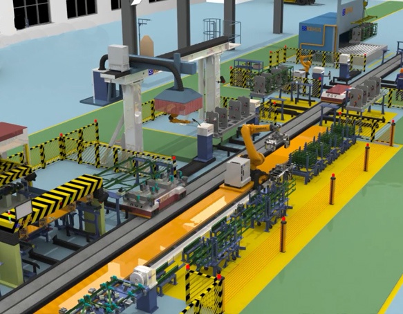整條智能化柔性生產(chǎn)線從左向右呈“一”字型布置的柔性焊接生產(chǎn)線,共劃分為包含生產(chǎn)工位和存放區(qū)域在內(nèi)的15個工位區(qū),能夠滿足多種系列工件的共線生產(chǎn)。生產(chǎn)線采用焊接機(jī)器人、裝配機(jī)器人、RGV、自動換槍裝置、自動檢驗(yàn)校對平臺、伺服翻轉(zhuǎn)變位機(jī)、物料快裝定位小車、柔性工裝、回火爐等,通過信息化生產(chǎn)指揮調(diào)度系統(tǒng)統(tǒng)一調(diào)試生產(chǎn),實(shí)現(xiàn)裝配焊接工位標(biāo)準(zhǔn)化、作業(yè)過程程序化、部件裝卸運(yùn)輸自動化、生產(chǎn)管理信息化。